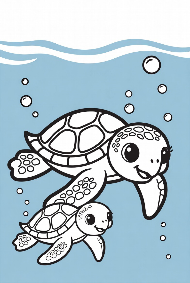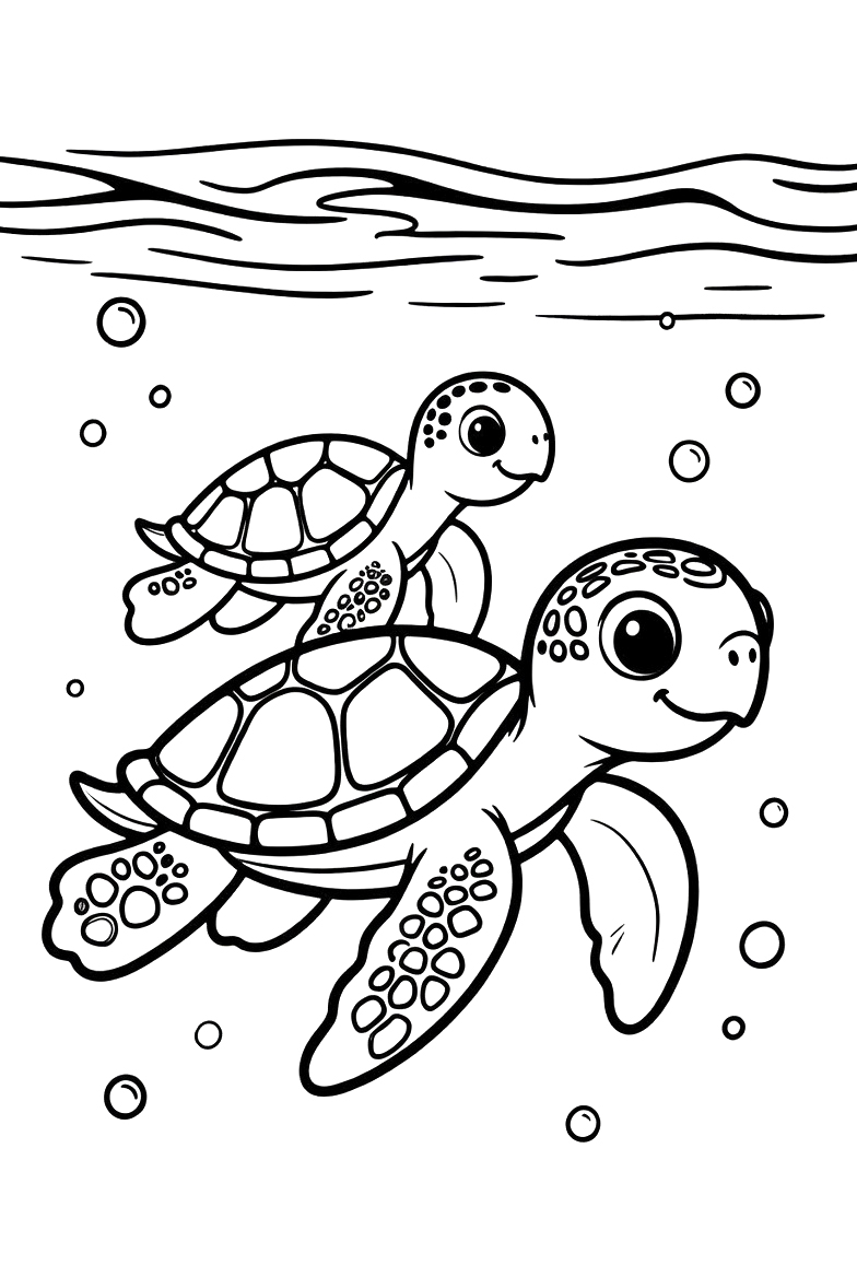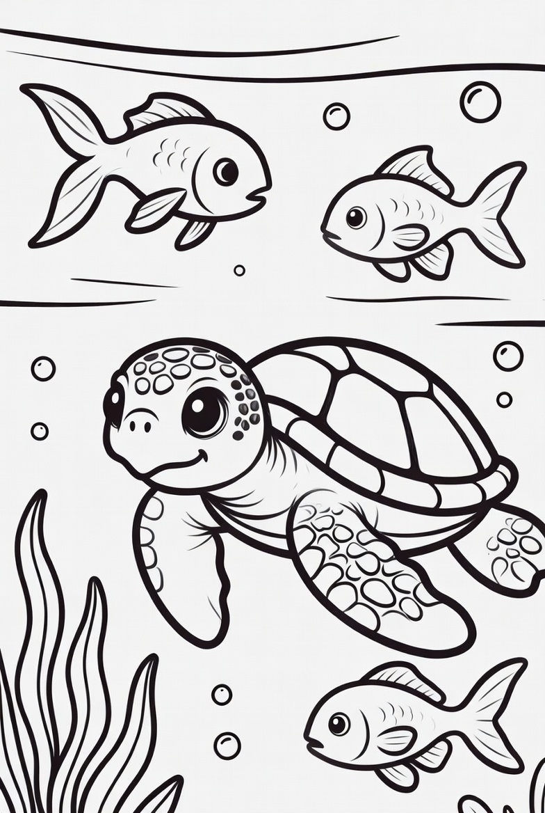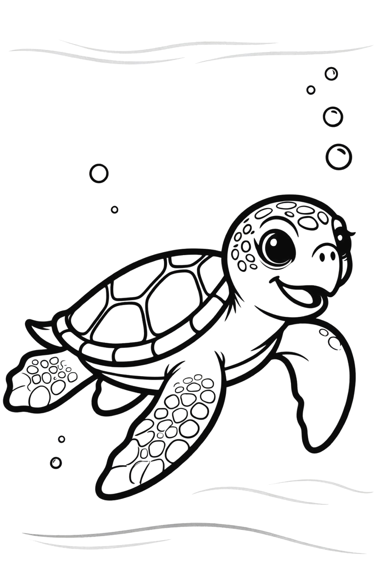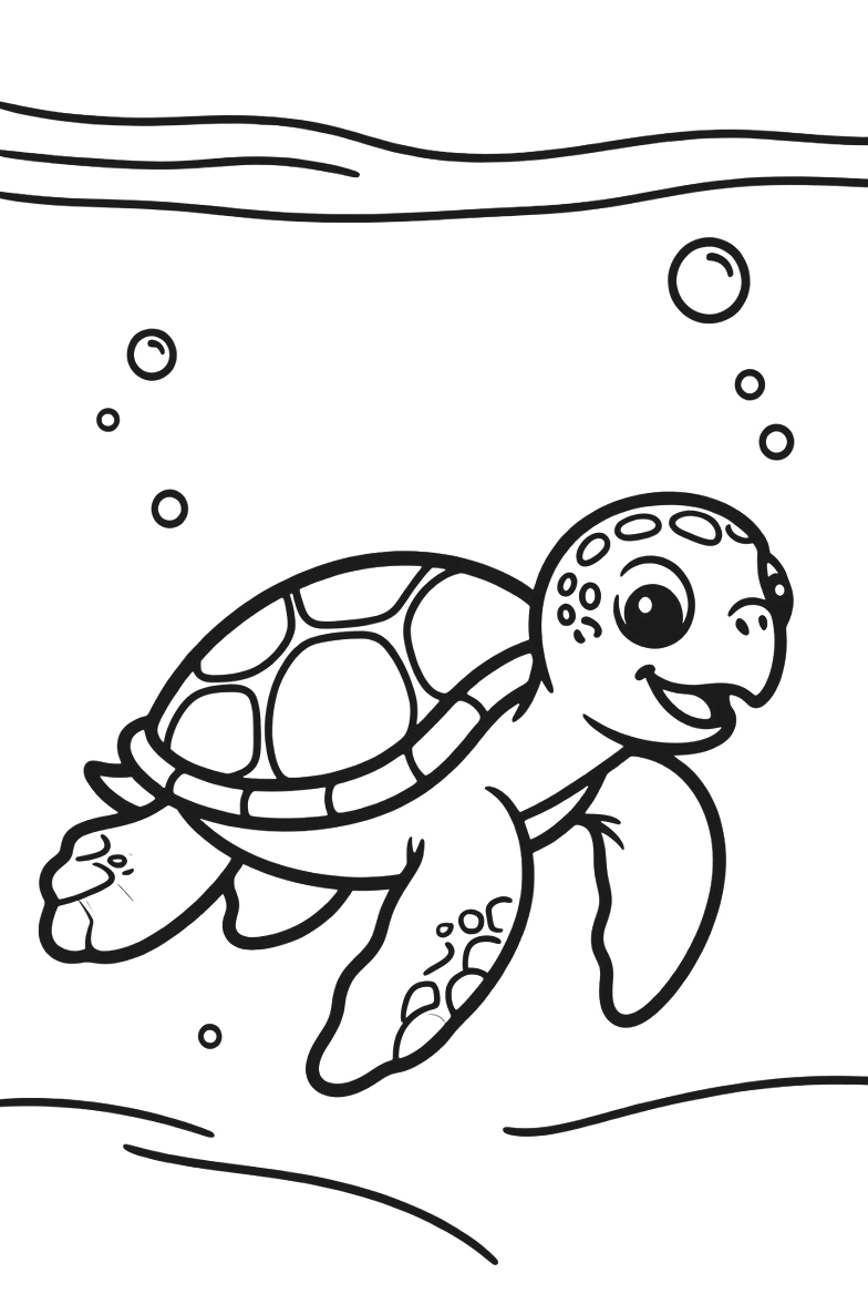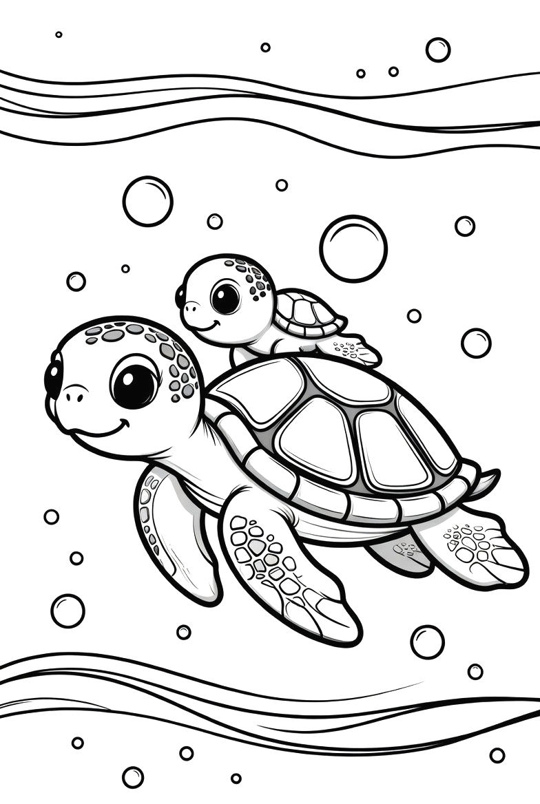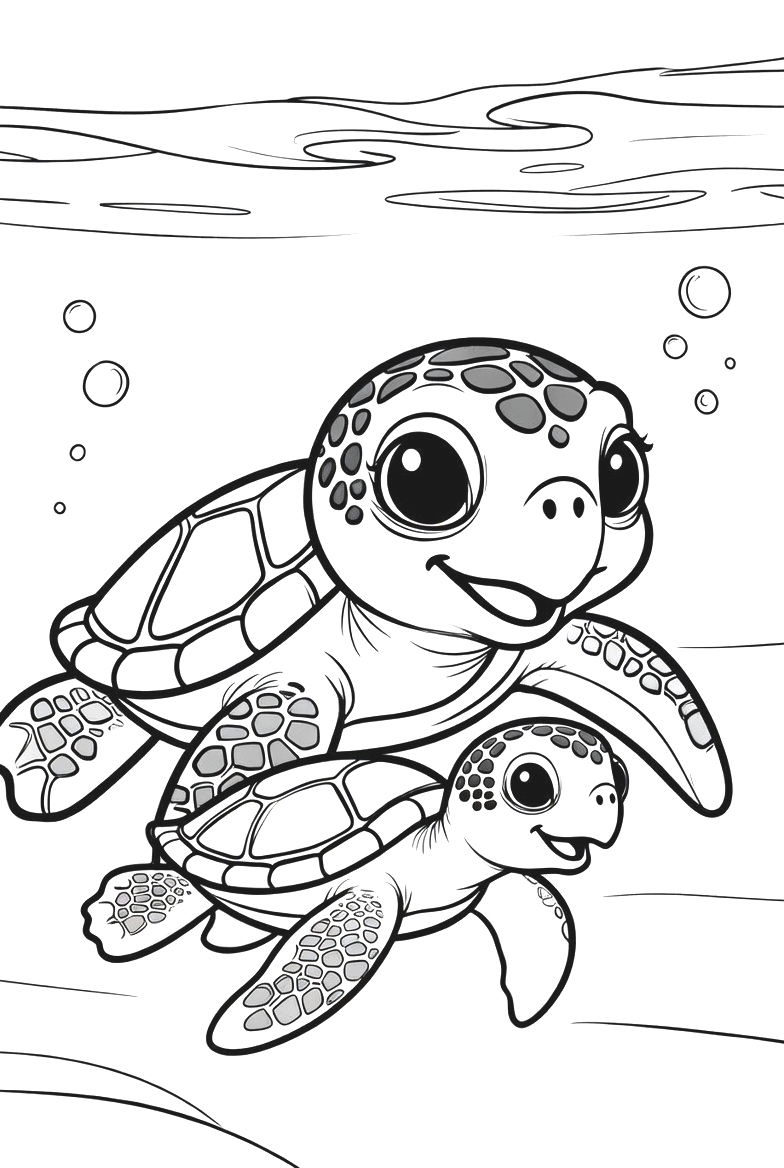 75 Turtle colouring in pages, all 75 are free to save and print. Cute turtles to color in! Turtles swimming to the left or right, swimming alone or with friends or family, sometimes swimming with fish and between seaweed, under the ocean, often with bubbles. Turtles just being turtles!