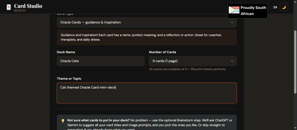 Not sure what cards to include? Use the optional brainstorm step to generate and cherry-pick your card titles before building.